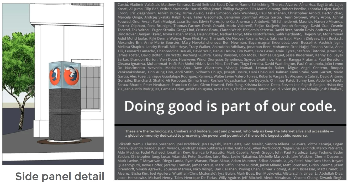This vision was realized in a year long project to get the monument installed outside the Mozilla San Francisco space.